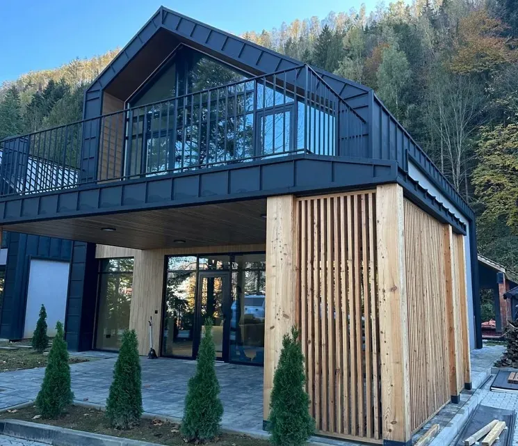 Новий авторський проект котеджного містечка з виглядом на гірську місцевість та з власним великим басейном. 12 сучасних вілл створюють великий архітектурний ансамбль у самому серці Карпат – в курортному містечку Яремче.