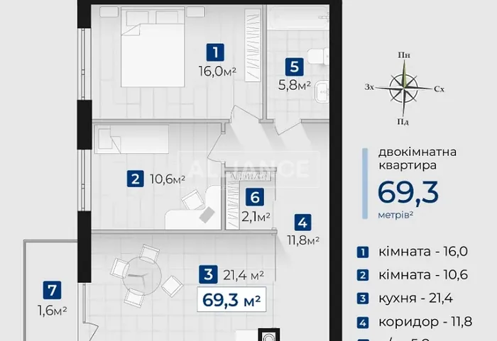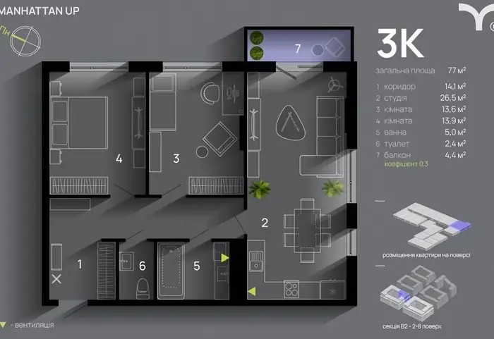 3-х кімнатна квартира, ЖК Manhattan UP, 77м2