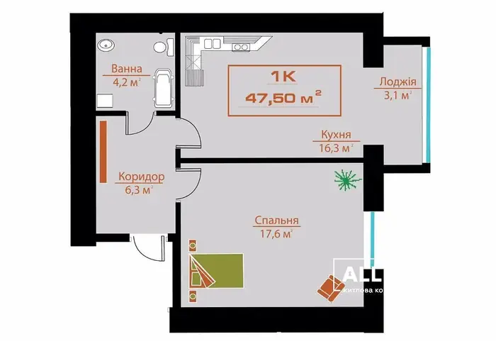 1 кімнатна квартира (квартира доукомплектовується меблями)