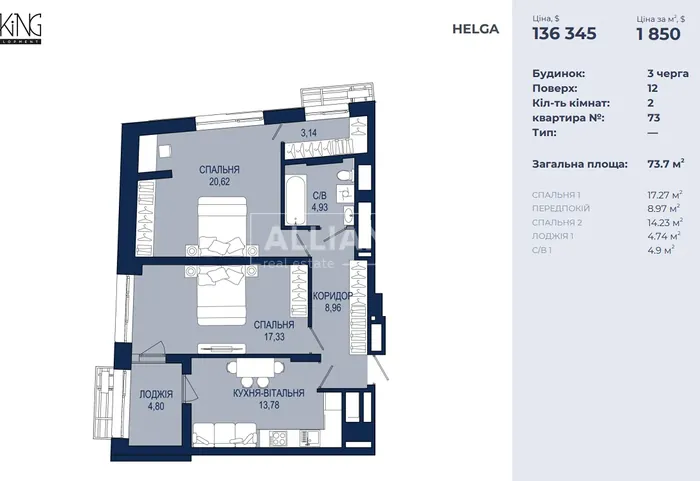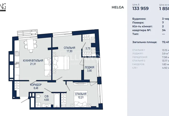 Продаж 2к в ЖК Helga 72,41м2 / 1850$ 7/12 Без комісії