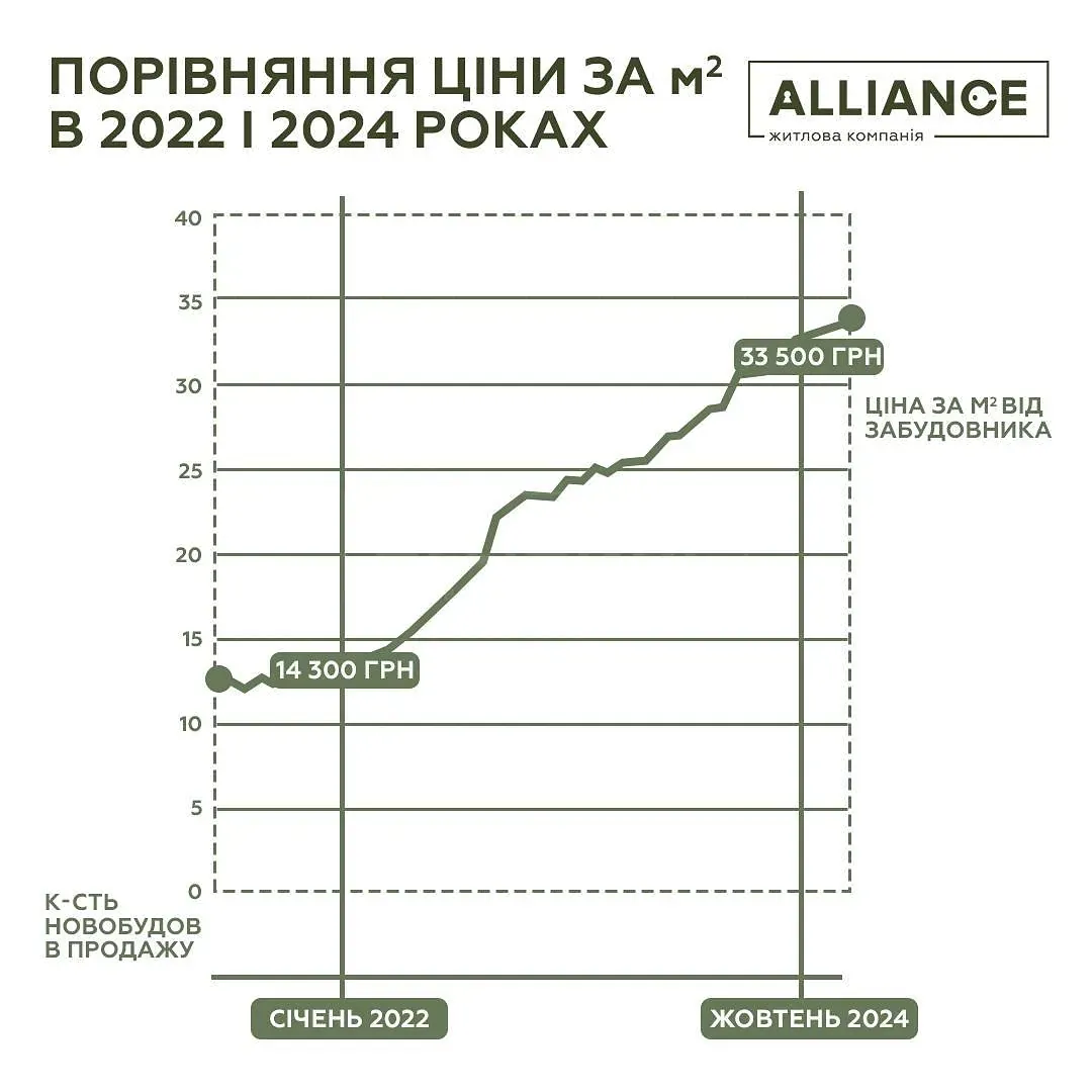 На початку 2022 середня вартість становила 14 000-15 000грн (550$) за м2. А вже наприкінці 2024, в середньому, дорівнює 33 000-34 000 за м2 (820$)