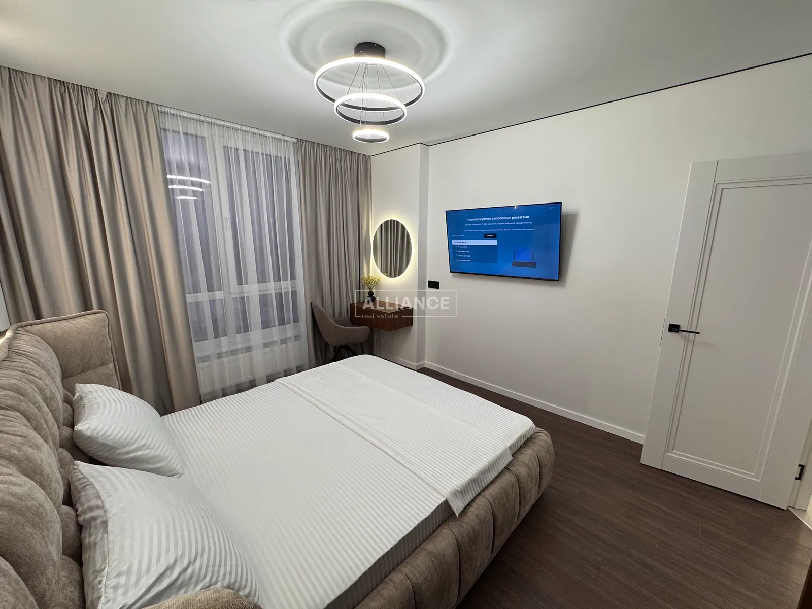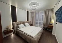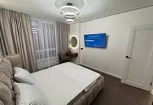 — Простора спальня з великим ліжком, вбудованими тумбами та стильним освітленням