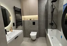 — Сучасна ванна кімната з душовою зоною, дзеркалом з підсвіткою та пральною машиною