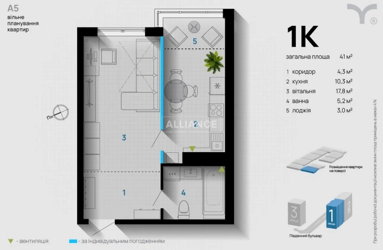 Квартира має вдале планування: окрема кімната, простора кухня, та зручний коридор. Є можливість перепланування під ваш смак.