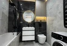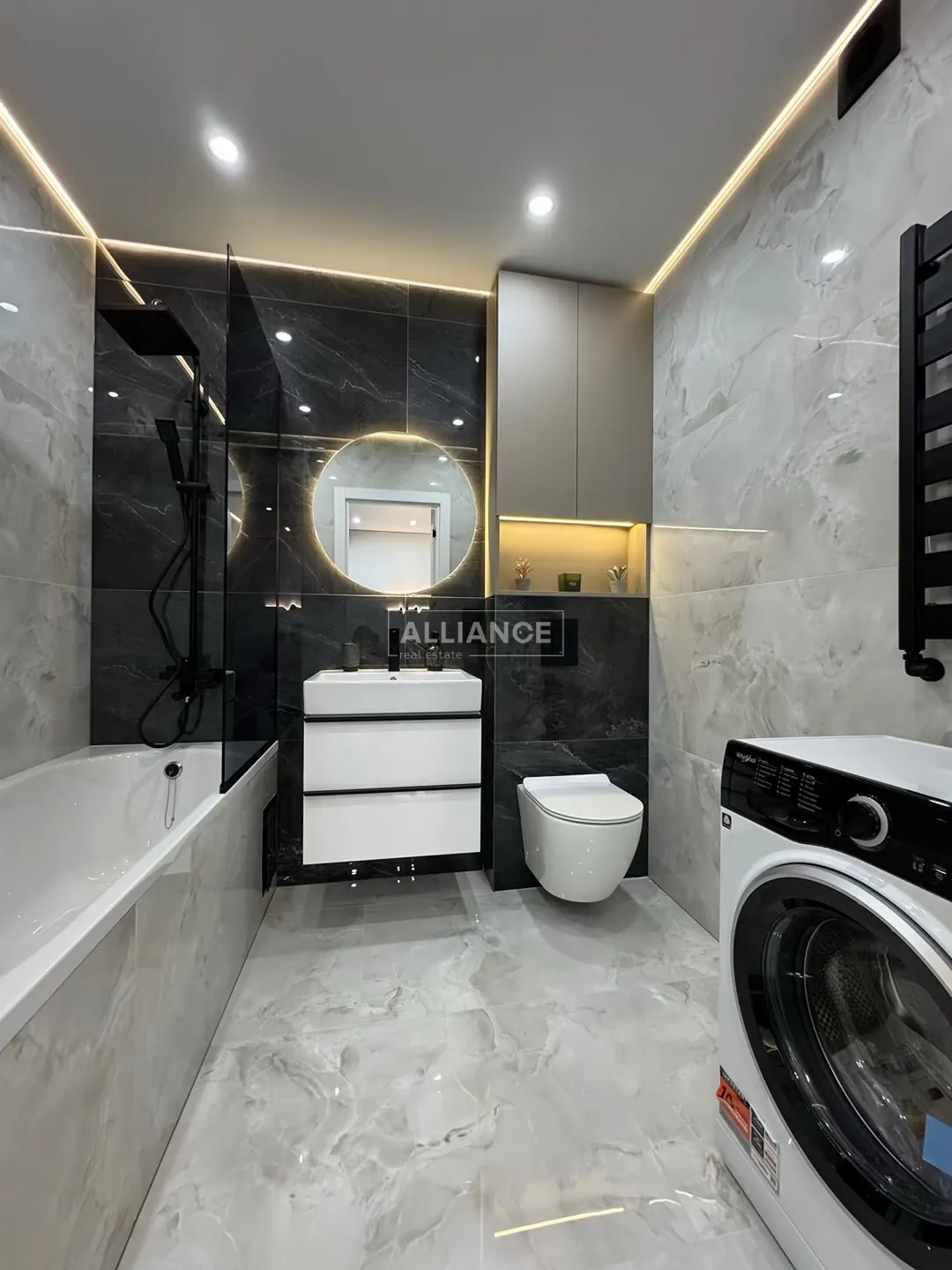 — Сучасна ванна кімната з душовою зоною, дзеркалом з підсвіткою та пральною машиною
