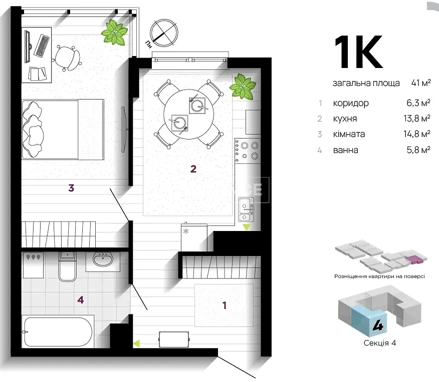 Роздільне планування: 1 окрема кімната-спальня та кухня-студія