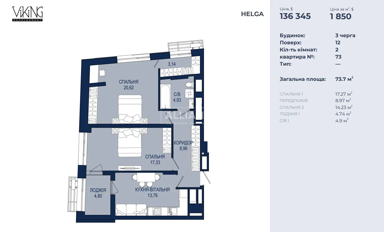 Продаж 2к квартири 73,7м2/1850м2 ЖК Helga