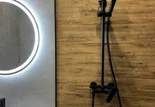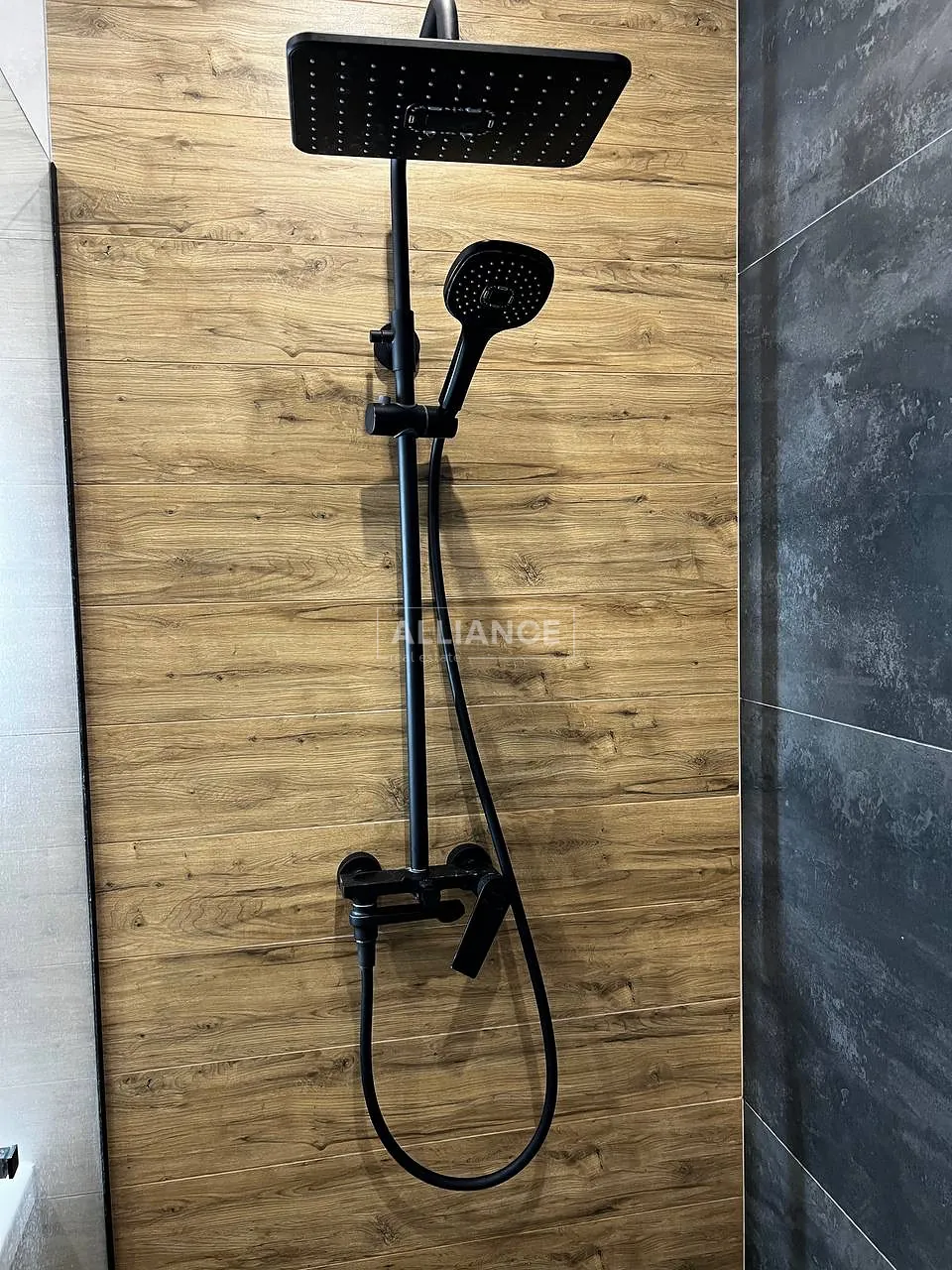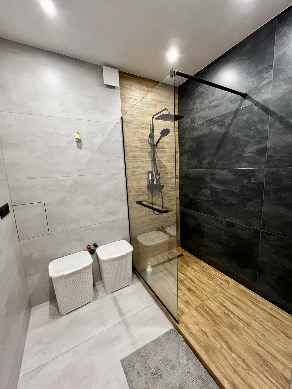 • Душова зона з чорними акцентами, надміцним склом і зручними тримачами для рушників.