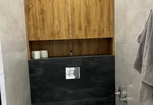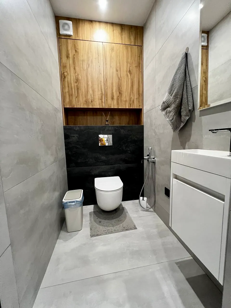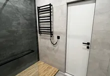 • У ванній кімнаті встановлена якісна чорна рушникосушка.