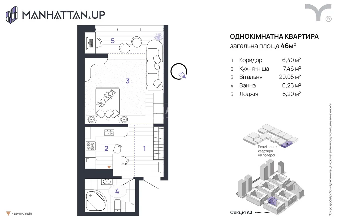 Простора та функціональна однокімнатна квартира загальною площею 46 м² з продуманим плануванням. Ідеально підходить для комфортного проживання однієї людини або пари, а також як вигідна інвестиція для оренди.
