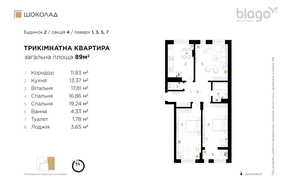 • Поверх 5/8, всього 3 квартири на поверсі — тиша та комфорт сусідства.