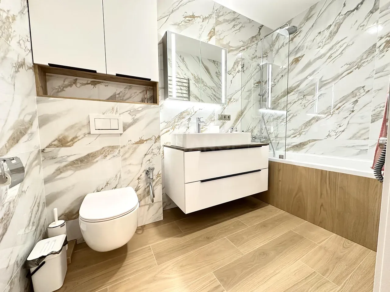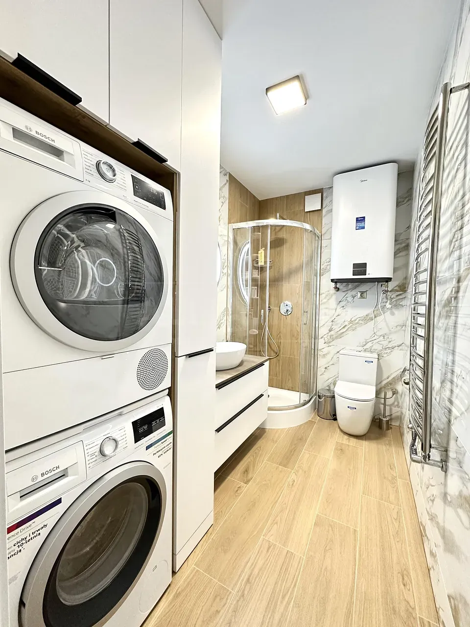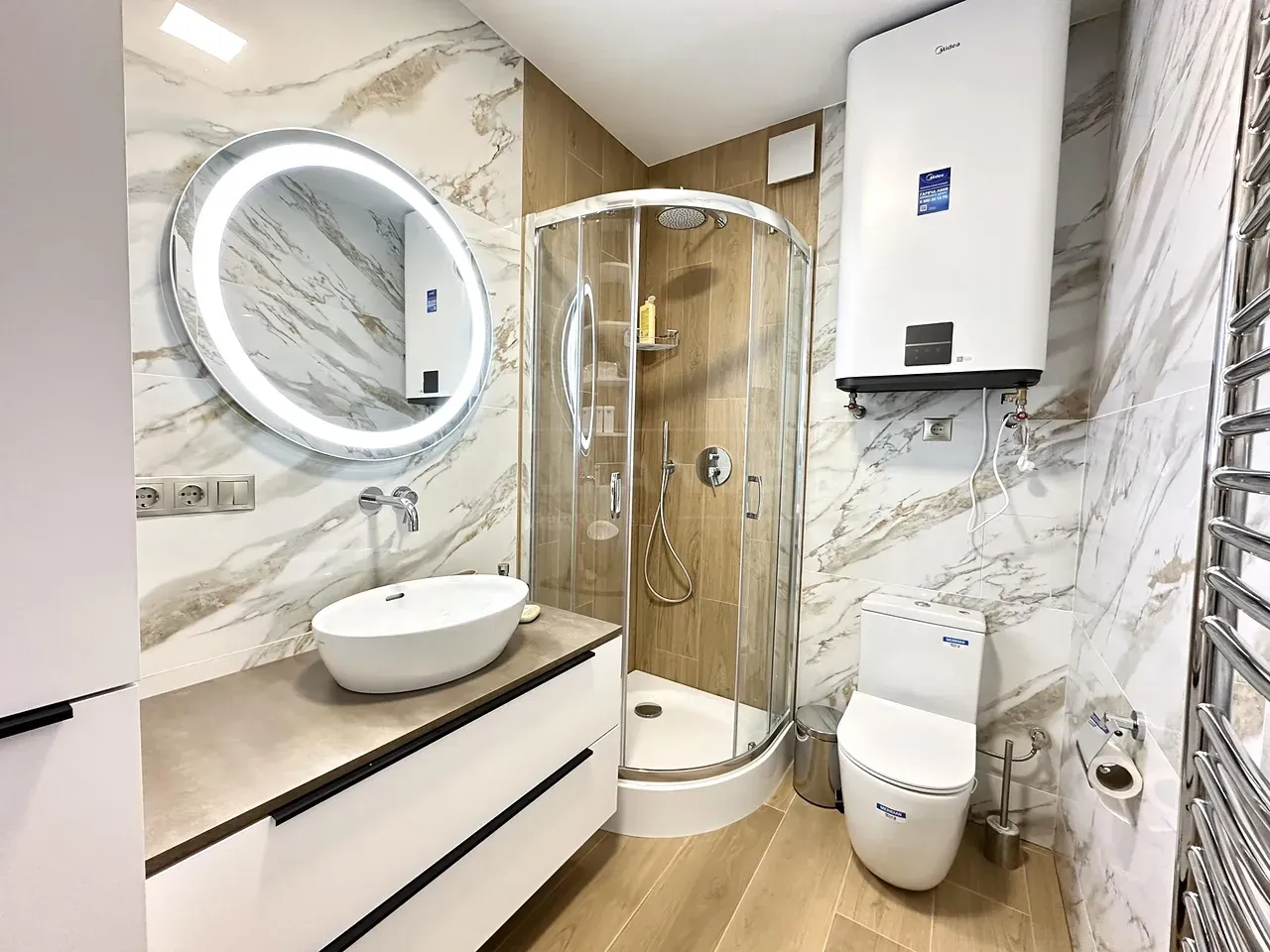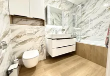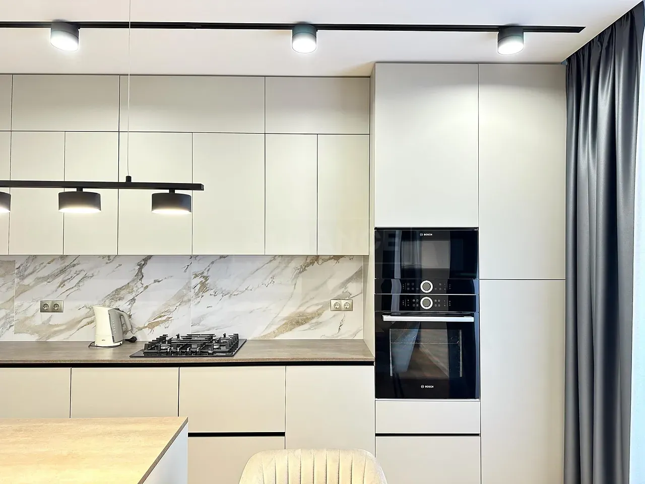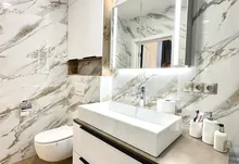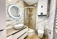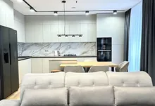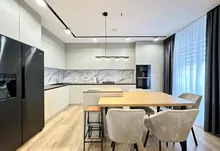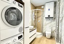 Квартира повністю укомплектована меблями та технікою. Кухня повністю укомплектована преміальною технікою фірми BOSH. Вмонтована духова та мікрохвильова піч, велика посудомийна машина 60, двох-дверний холодильник, варильна газова поверхня та витяжка. Вся фурнітура – BLUM. В квартирі індивідуальне газове опалення, встановлений двоконтурний конденсаційний газовий котел, а також встановлено додатково бойлер – для зручності. Також у квартиру заведено 10 кВт світла. Тепла підлога повністю по всій квартирі. Встановлено 2 кондиціонера, які працюють, як на обігрів – так і на охолодження. Батьківській санвузол облаштований ванною зі скляною перегородкою, інсталяцією, гігієнічним душем та дзеркалом-шафою з підсвіткою.