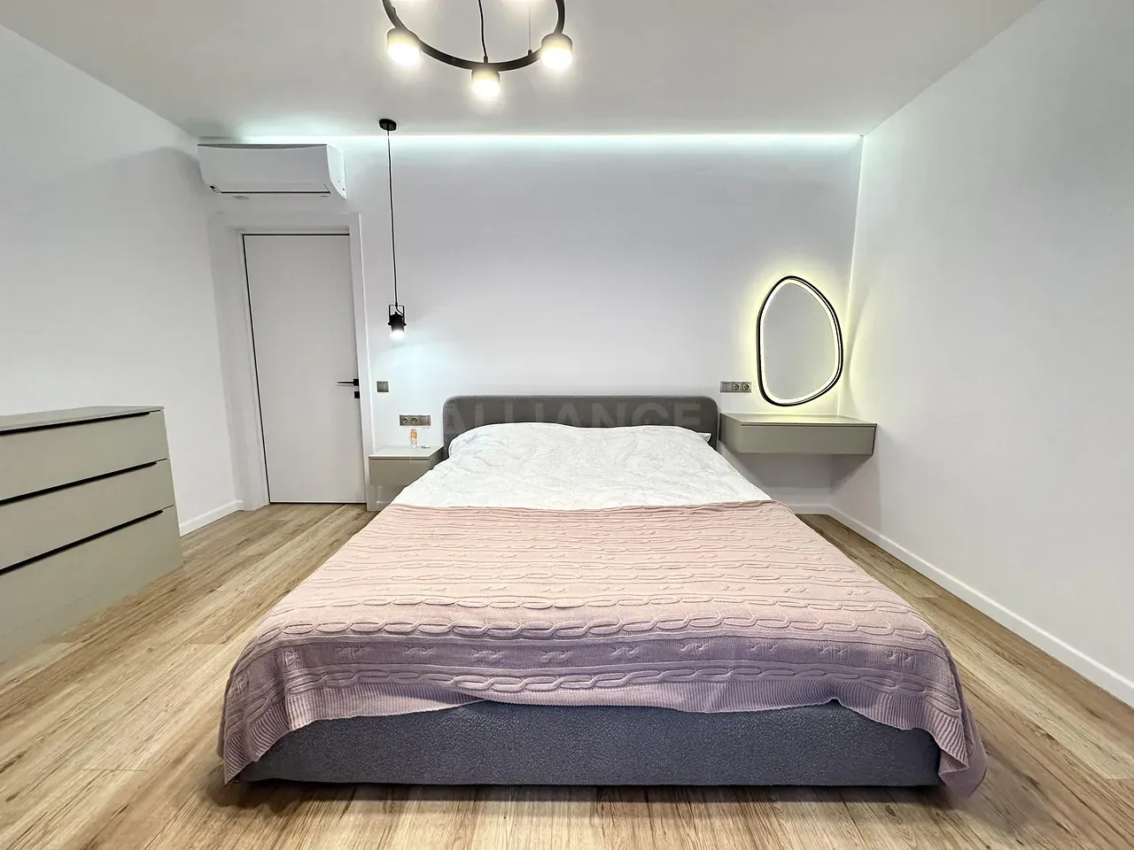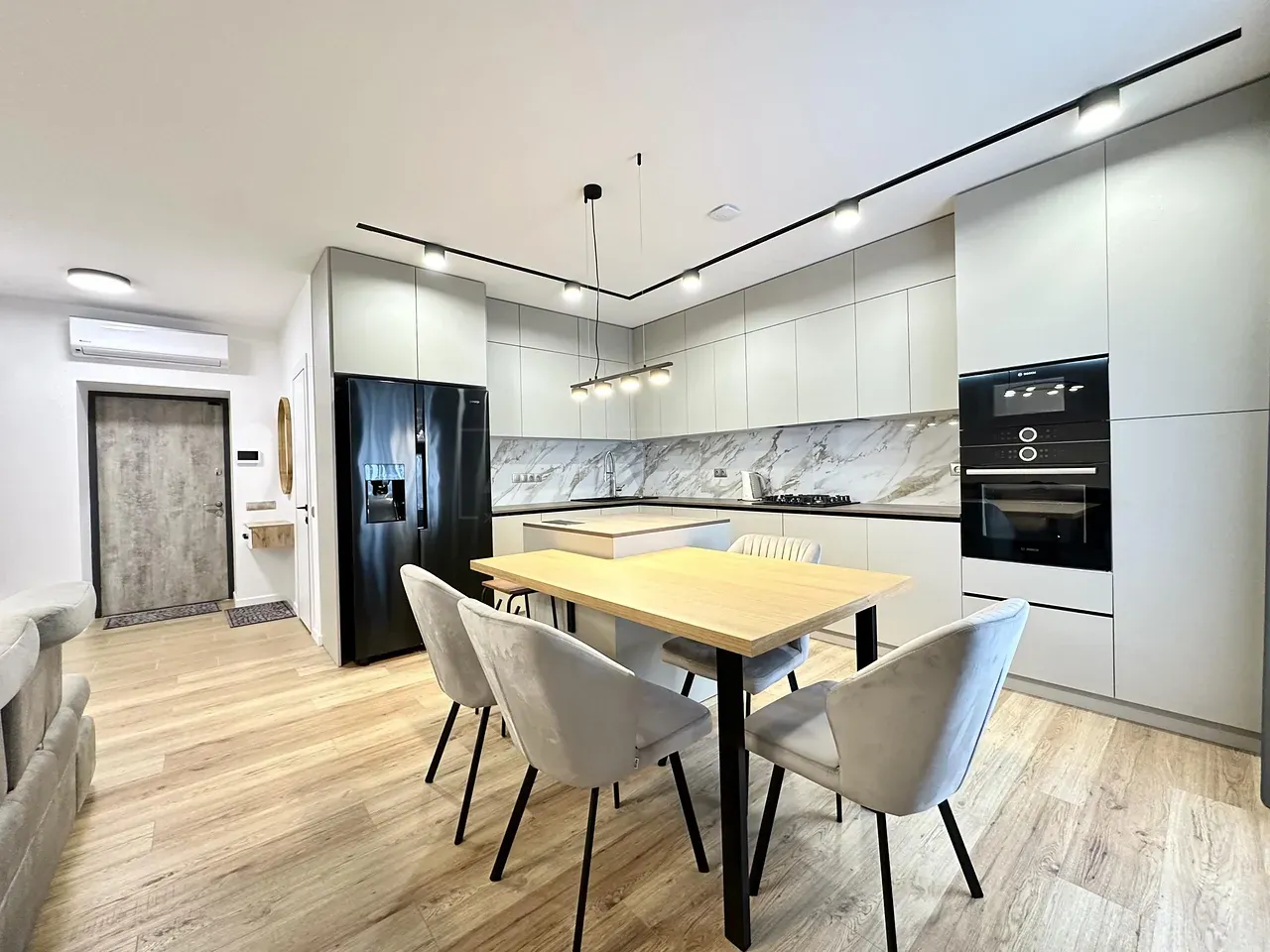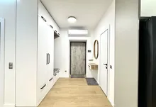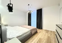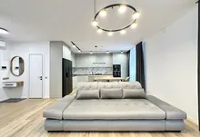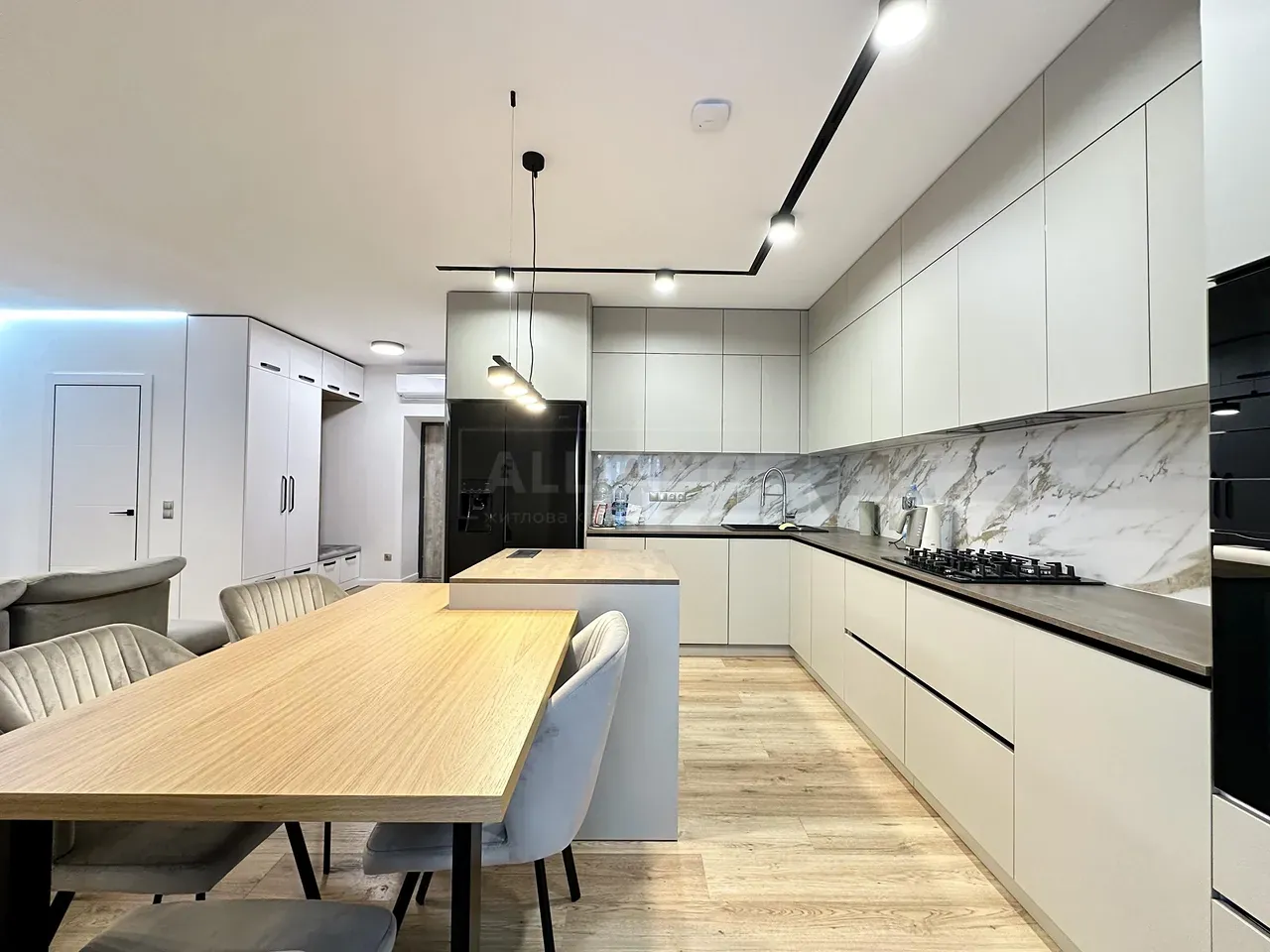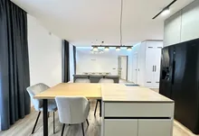 Вхідна група укомплектована вмонтованими шафами для зберігання одягу, гостьовий санвузол та велика гардеробна кімната, яку ви можете доукомплектувати індивідуально під свої потреби. Далі ви потрапляєте у велику кухню-студію, яка має робочу зону та стильний острів зі столом, а також відпочинкову зону з великим розкладним диваном та місцем під телевізор. Також є відділена велика зона, яка може використовуватися як робочий кабінет з великими панорамними вікнами. Наступна кімната це простора батьківська спальна з власним санвузлом, шо дає додатковий комфорт для вашого проживання.