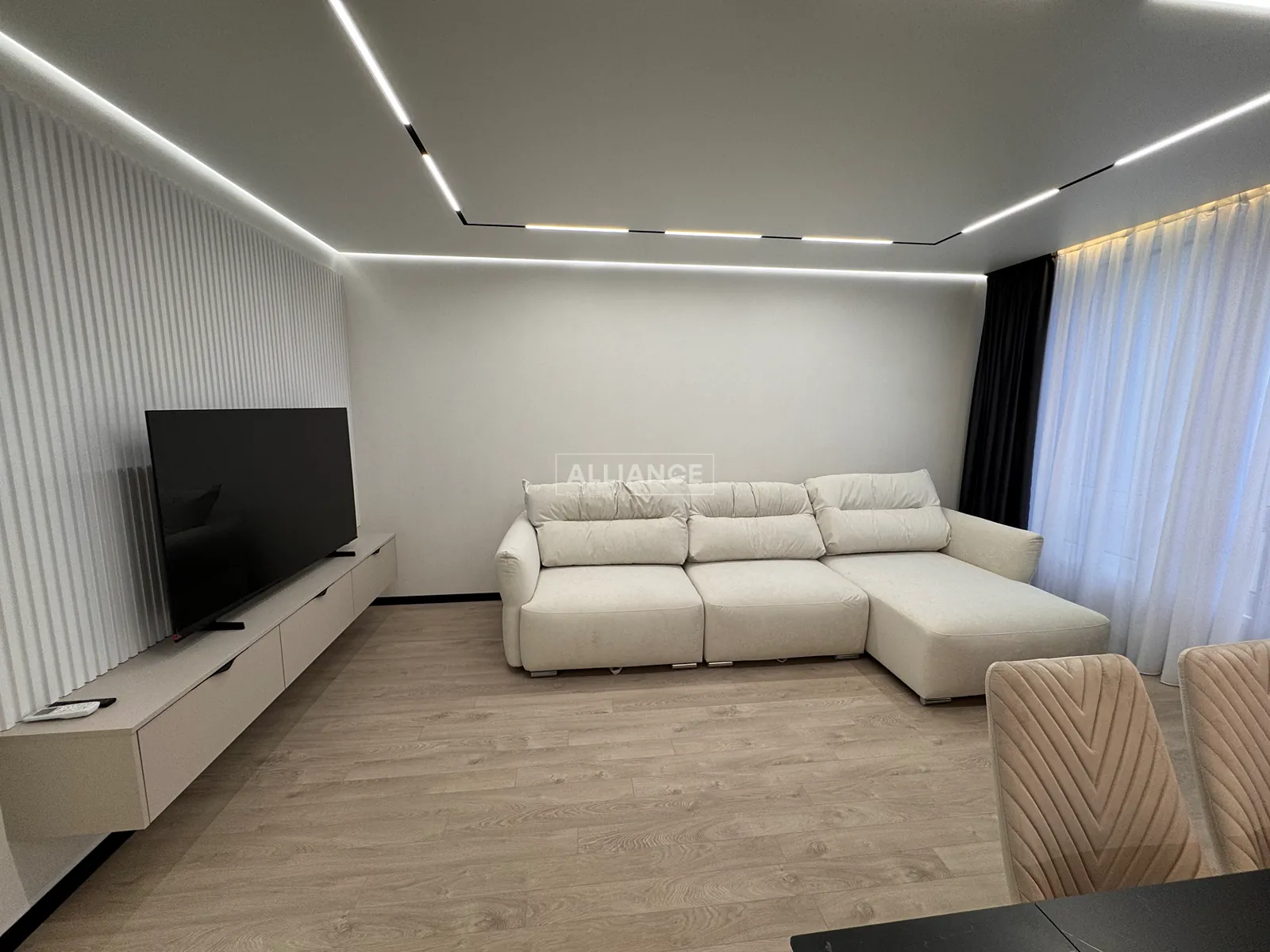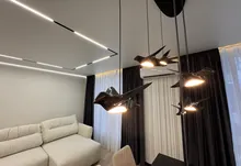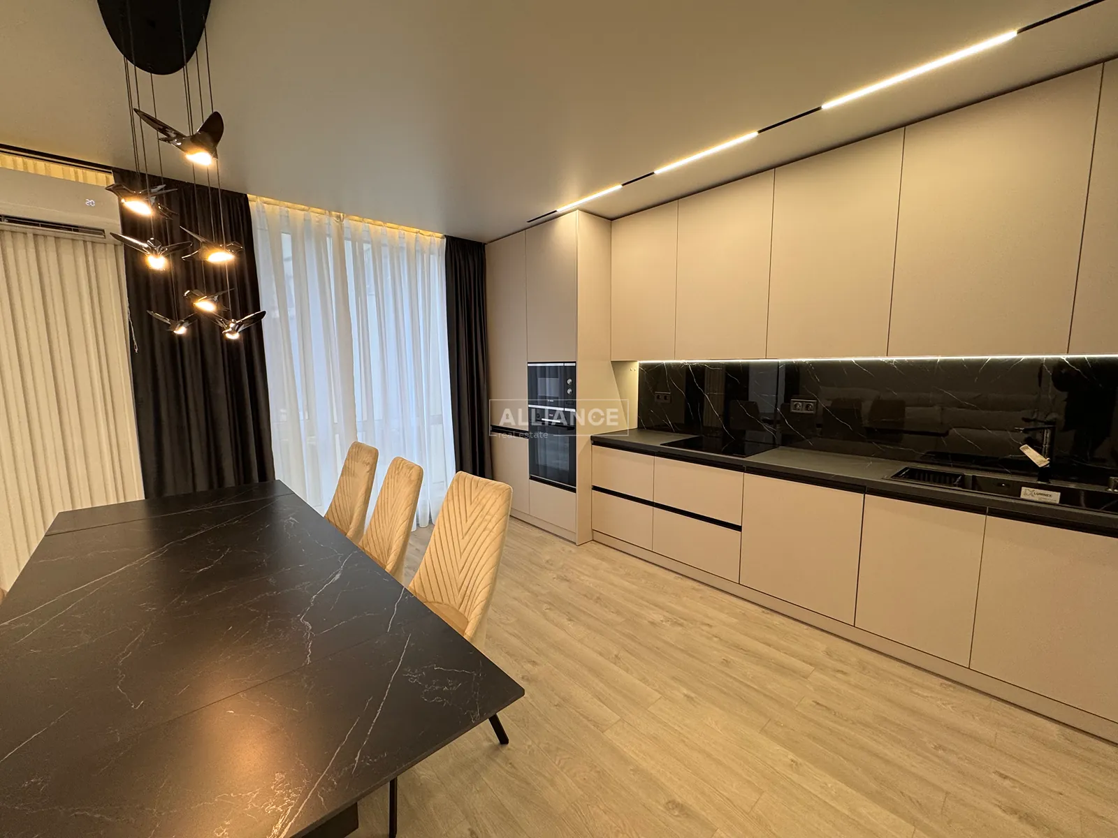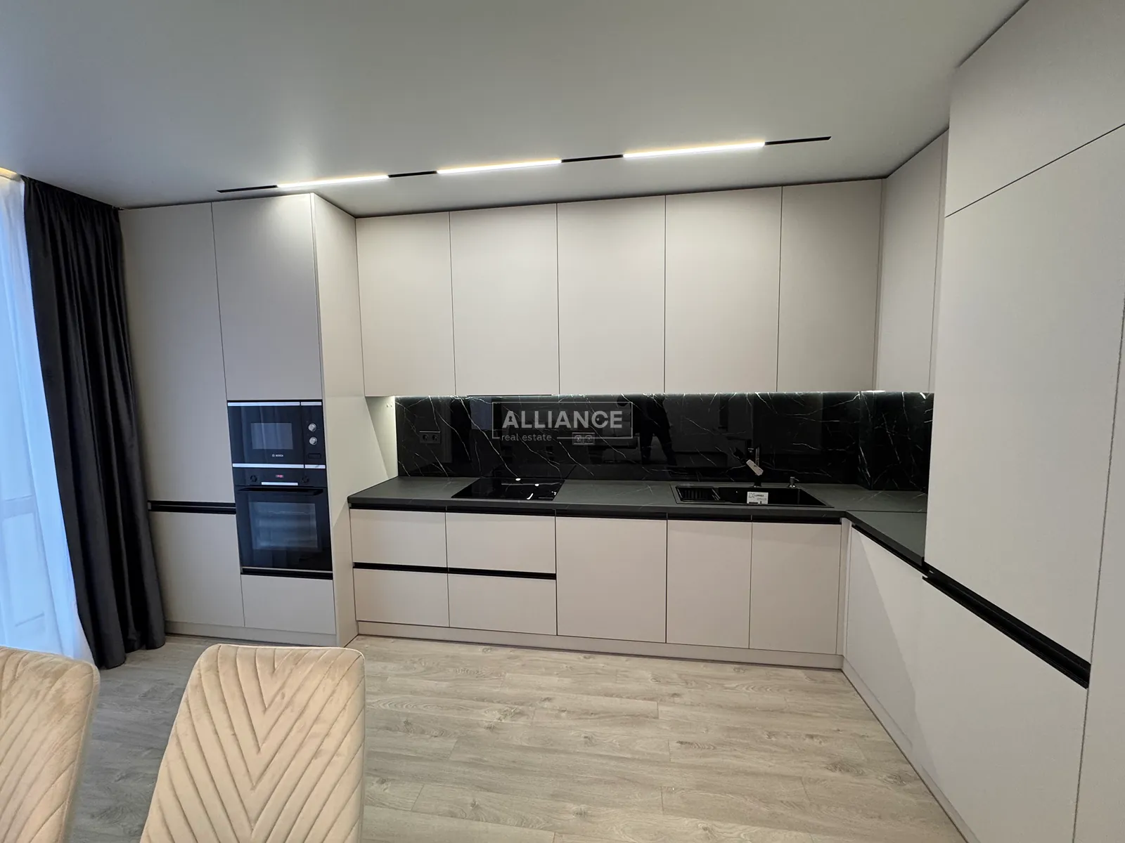 Інтерʼєр виконаний у сучасному мінімалістичному стилі — поєднання світлих фасадів, чорних акцентів та теплої підсвітки створює атмосферу затишку та статусу.