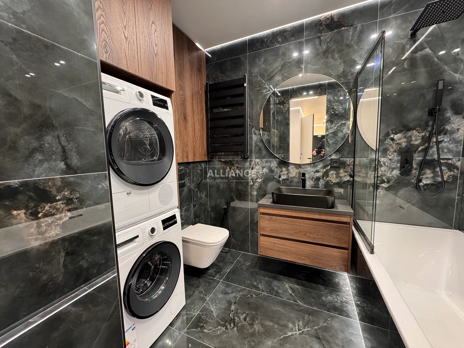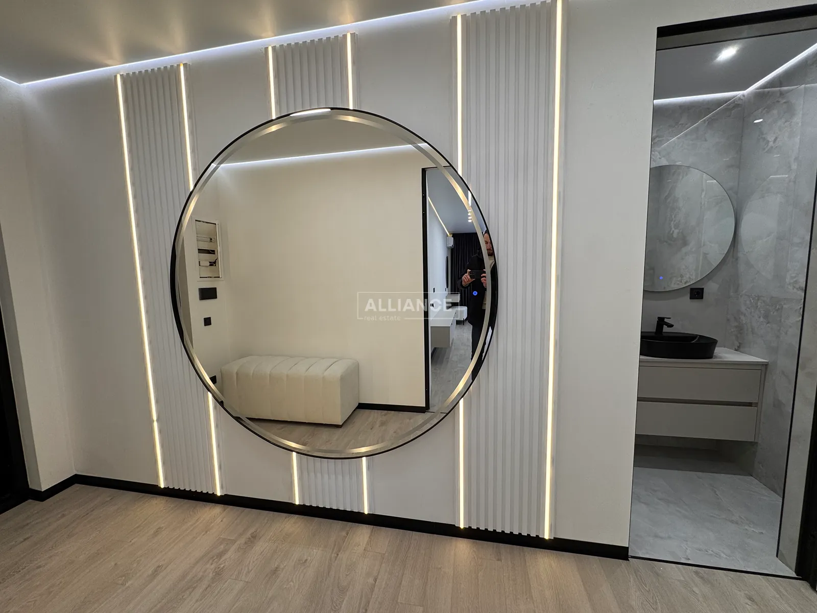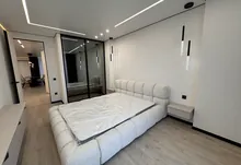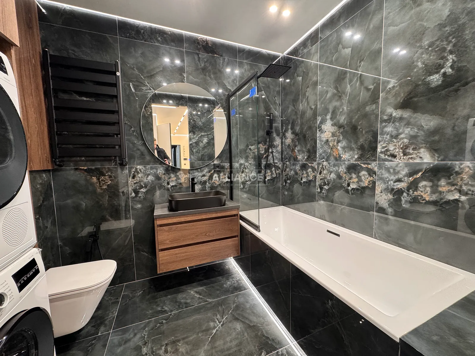 Інтерʼєр виконаний у сучасному мінімалістичному стилі — поєднання світлих фасадів, чорних акцентів та теплої підсвітки створює атмосферу затишку та статусу.