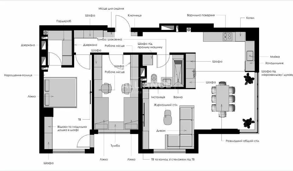 Готовий дизайн-проєкт входить у вартість і передбачає саме таке планувальне рішення