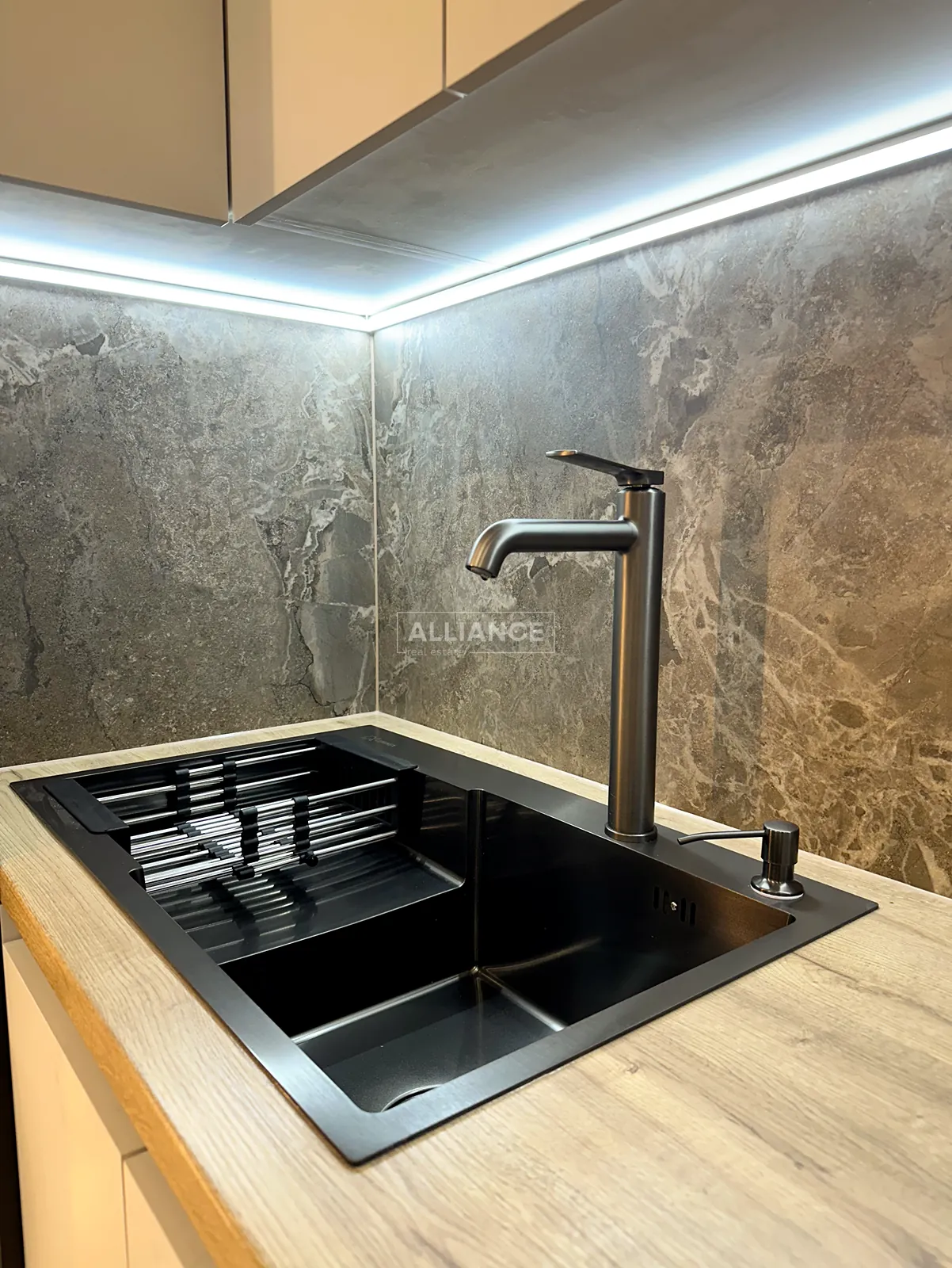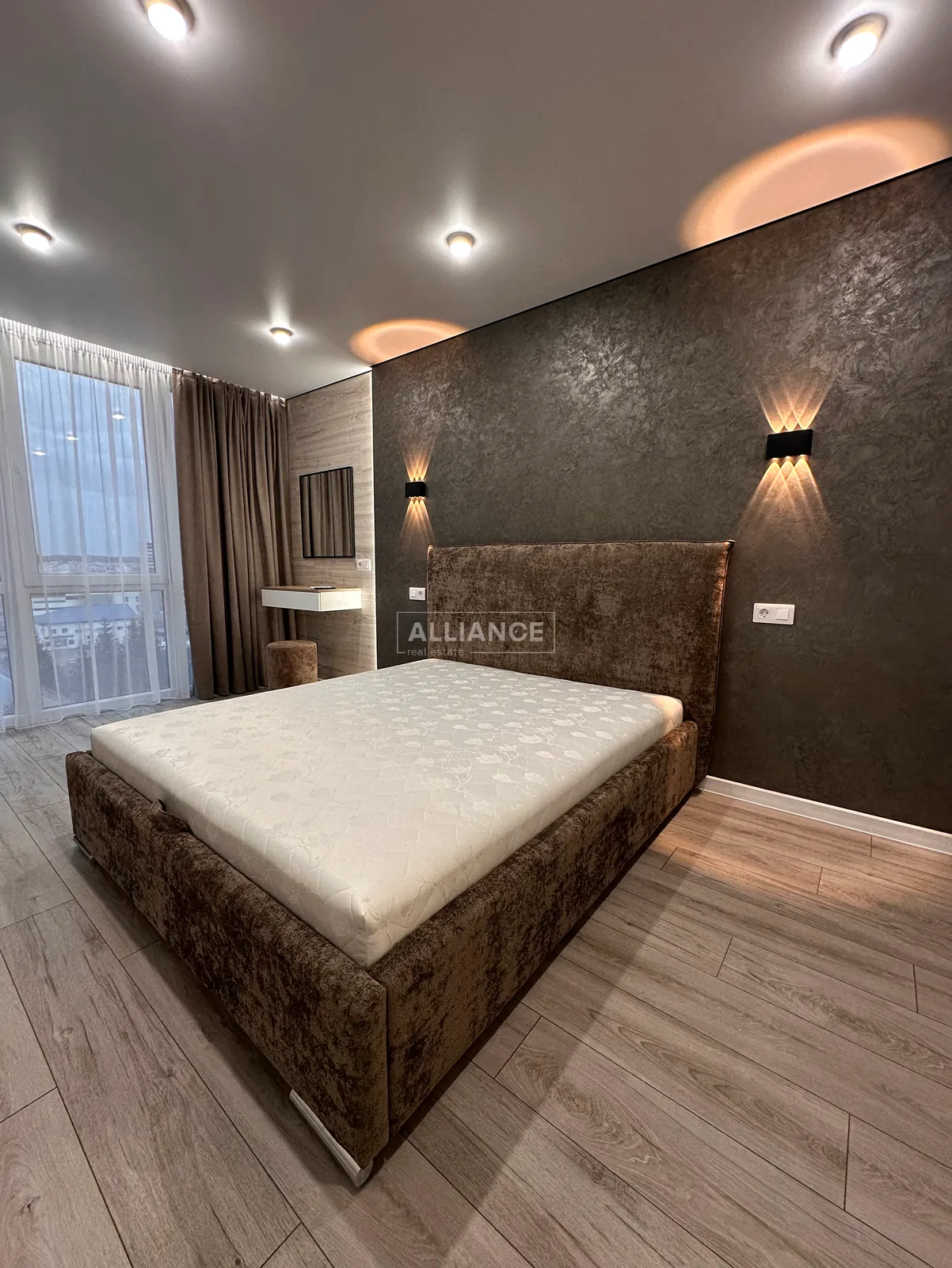 Квартира має продумане планування : простора кімната з великим спальним ліжком, місткою шафою та робочою зоною, окрема сучасна кухня з вбудованими меблями та технікою, а також акуратна ванна кімната з сантехнікою преміум - класу.