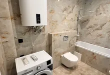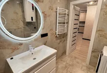 Суміжний санвузол виконаний з широкоформатної плитки у світлих тонах!