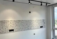 • Зона кухні з модною фактурною плиткою та стильним освітленням