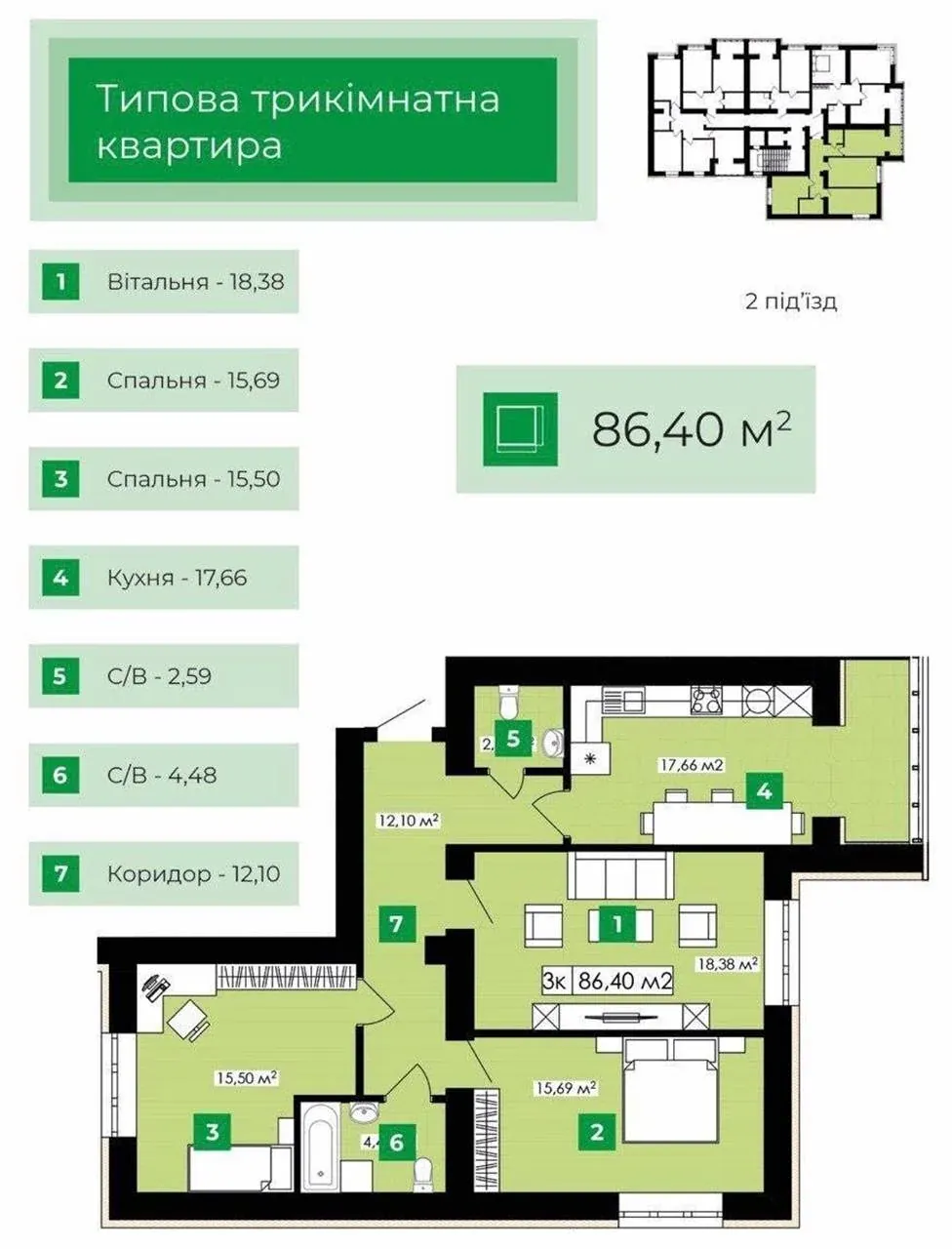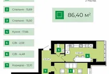 Загальна площа квартири становить 86 м².