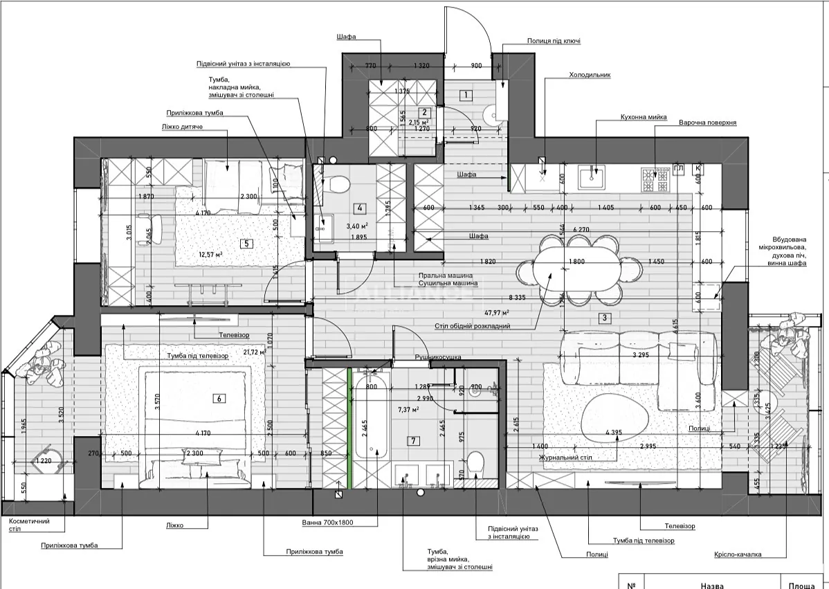 Квартира має функціональне планування: велика кухня-вітальня з обідньою зоною, окрема спальня, дитяча кімната, гардеробні та достатньо місць для зберігання. Простір грамотно зонований, що забезпечує комфортне проживання для всієї родини. Панорамні вікна та продумане розташування кімнат роблять квартиру світлою та затишною.