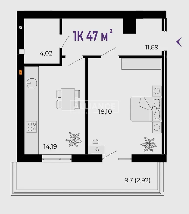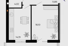 Зручне планування: кухня (14.2), спальня кімната 18.1 м2, тераса(9.7 м²), санвузол (4.02м²)
