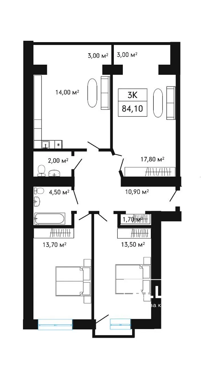 Квартира має гарне 2х стороннє планування , велику кухню, 3 окремі кімнати, роздільний санвузол, та гардеробна