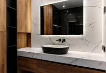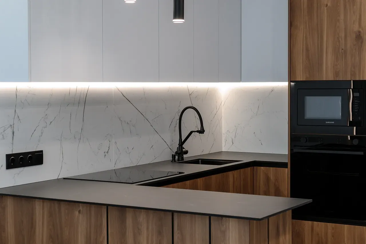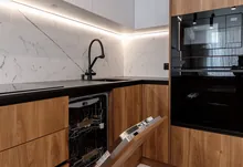 - на кухні встановлено: посудомийку, духова шафа, мікрохвильовка, індукційна плита, холодильник та морозильна камера, встановлено підсвітку робочої поверхні
