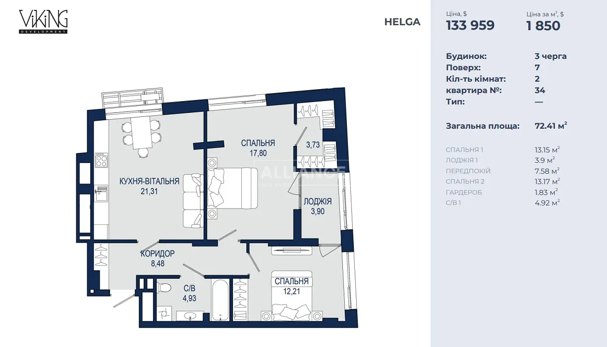 Продаж 2к в ЖК Helga 72,41м2 / 1850$ 7/12 Без комісії