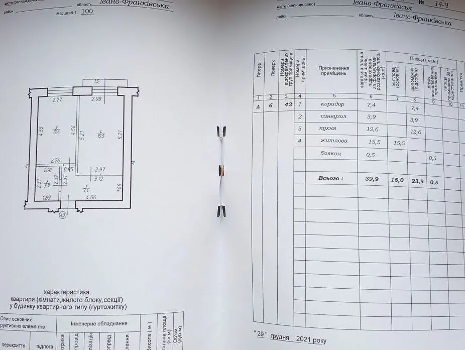 Квартира загальною площею 39,9 м2 розташована на 6 поверсі з 10;