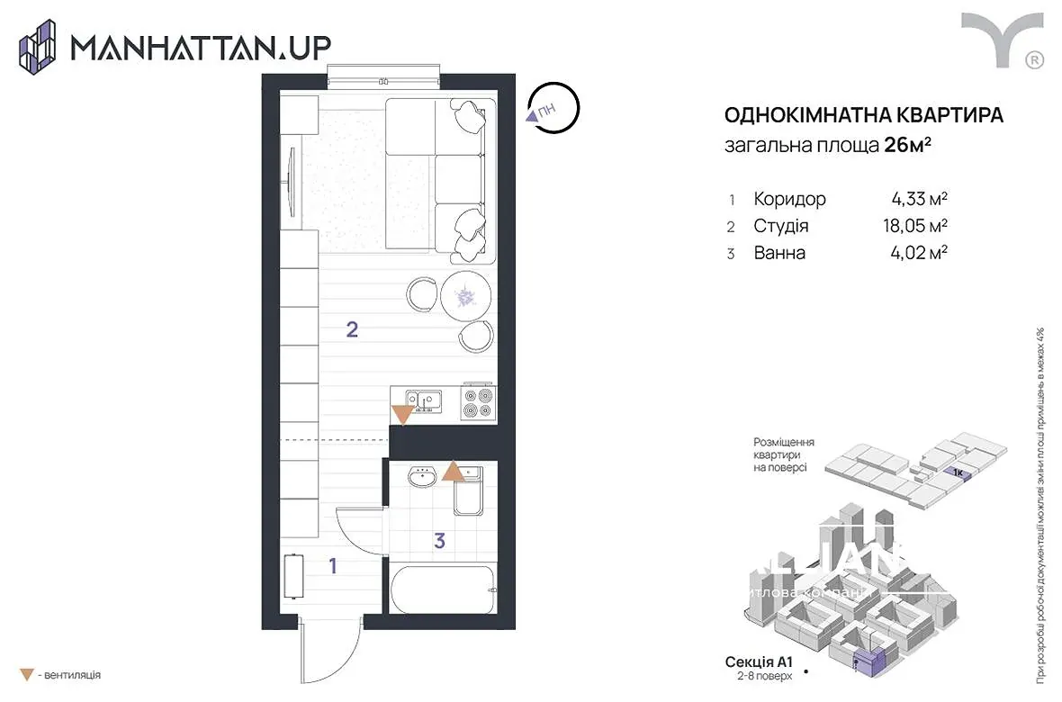 Продається 1 кімнатна квартира в ЖК Manhattan Up.Готова до ремонту