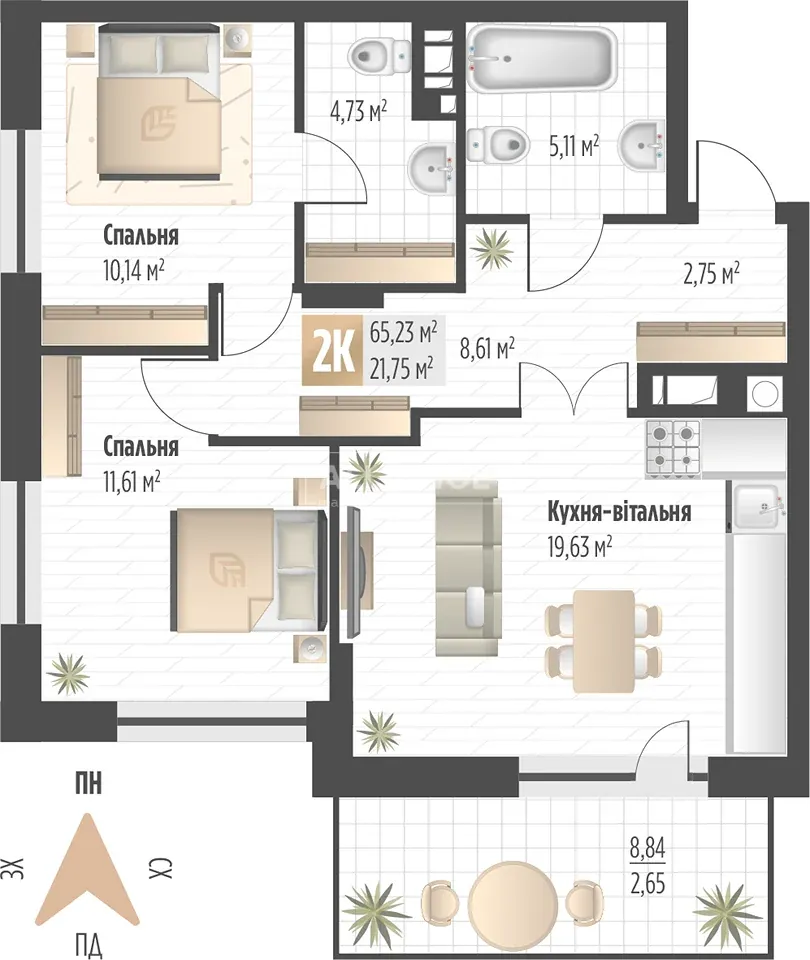 Пропонується до продажу затишна квартира площею 65,23 м², розташована на 2-му поверсі 5-поверхового будинку.