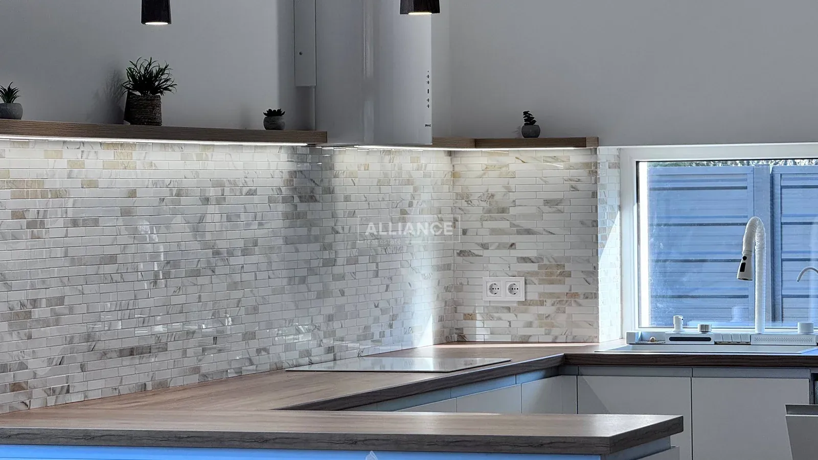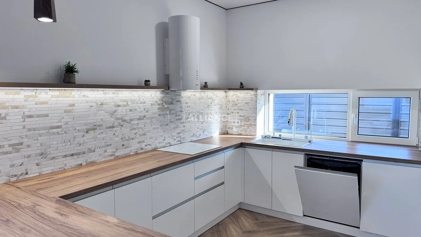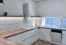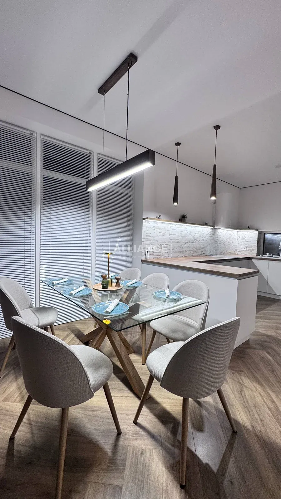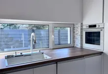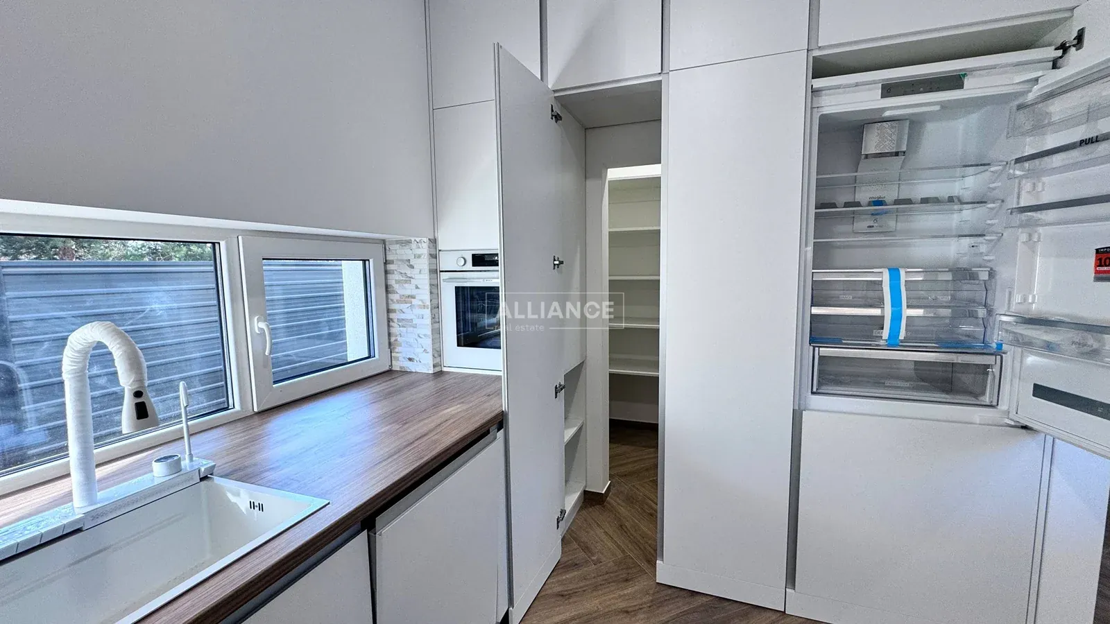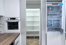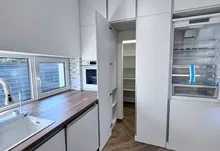 * на першому поверсі, велика кухня-вітальня., де кухонна робоча зона повністю облаштована меблями з мальованими фасадами з МДФ та якісною фурнітурою, а також уся необхідна побутова техніка (холодильник, варильна поверхня, духова шафа, мікрохвильова піч, витяжна система, посудомийна машина) Родзинкою кухні є прихована КОМОРА , яку переконаний оцінить господині, так як там можна буде зберігати дуже багато чого, від домашньої консервації до свіжих овочей та фруктів. Поруч з робочою зоною кухні маємо обідню зона, з столом та кріслами. Далі йде відпочинкова зоно, або зона вітальні: дизайнерський кутовий диван , камін, зона TV, великі панорамні вікна з виходом на подвіря.