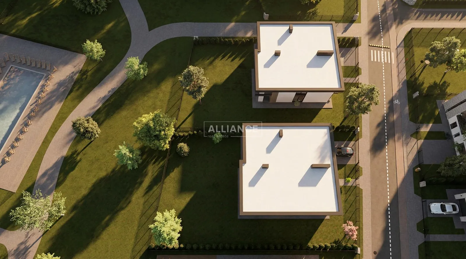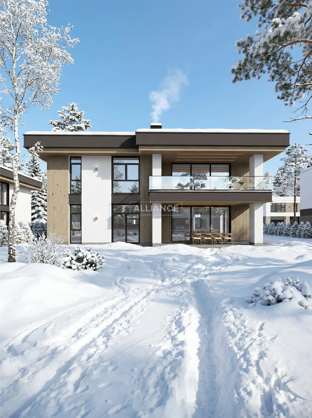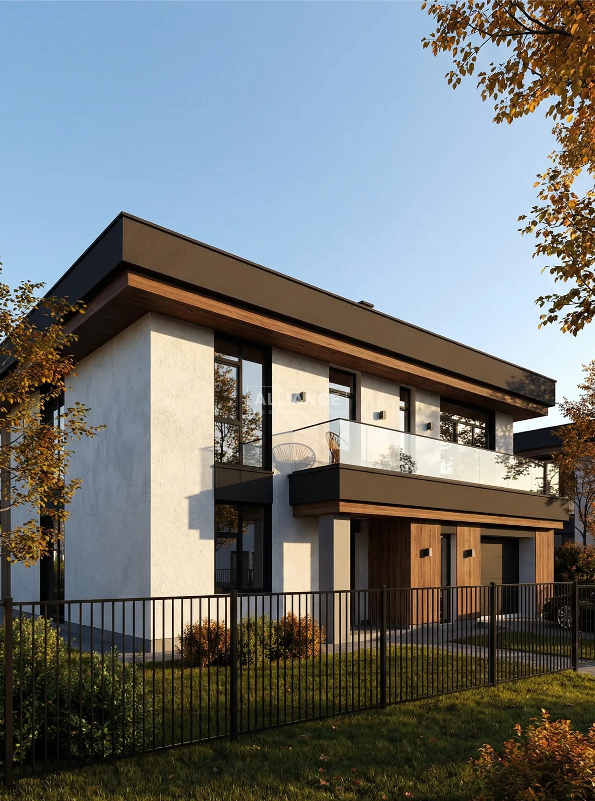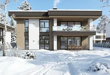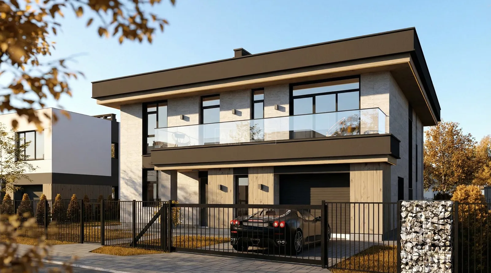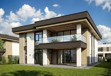 Будинок має сучасну архітектуру з плоским дахом, панорамні вікна, великі тераси та вбудований гараж. Територія комплексу закрита, забудова однорідна, сусідство відповідного рівня.