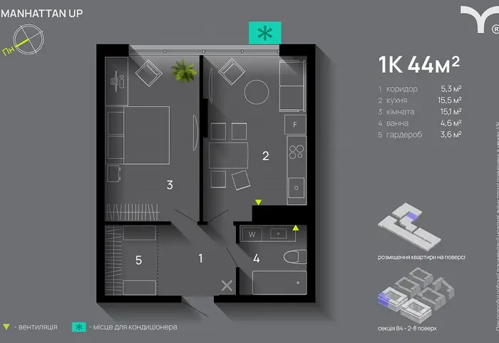 Простора 1-кімнатна квартира 49м² у ЖК Manhattan UP