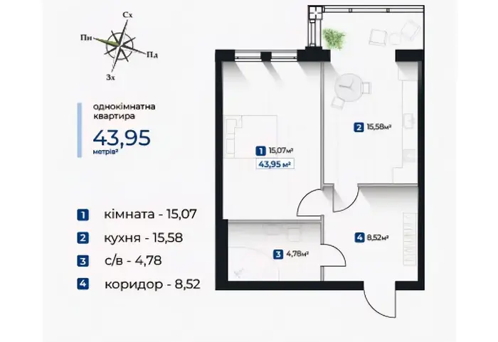 Укомплектована 1 кімнатна квартира