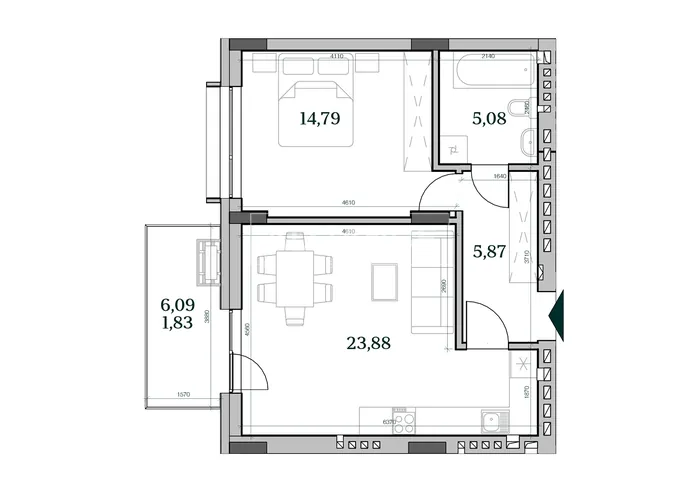1-кімнатна квартира 46.5 м² з панорамними вікнами — без комісії